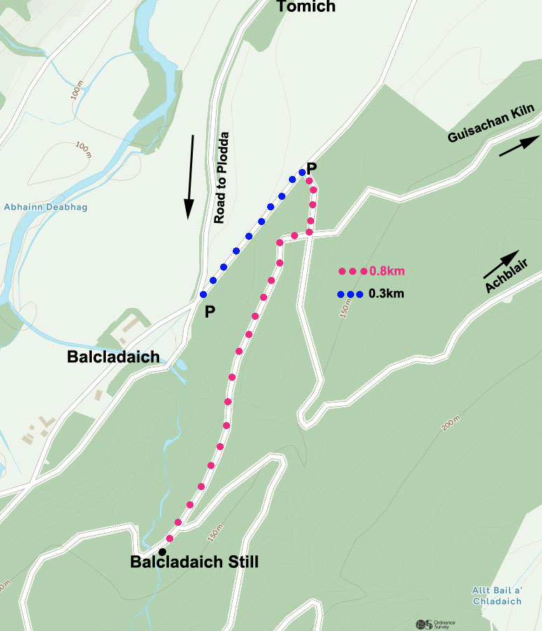 From Tomich village take the Plodda road, left at the fork, and after 1km turn into forest road on left hand side. Park here or further on at the entrance to forest – keep gates clear! Enter forest road and at junction turn right. Carry on passing a forest road heading uphill and the still is on your left concealed below the level of the road just before a burn.