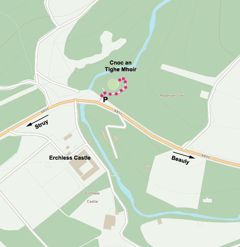 The burial ground is situated just off the A831 public road east of Struy village. From the village the burial ground is on the left 200 yards beyond the Cnoc Hotel. There is ample parking space for two cars. From the gate (as there is no fence at present, the gate is superfluous!) a path winds up around the motte to reach the graveyard. The path can be a bit slippy if the weather is wet.