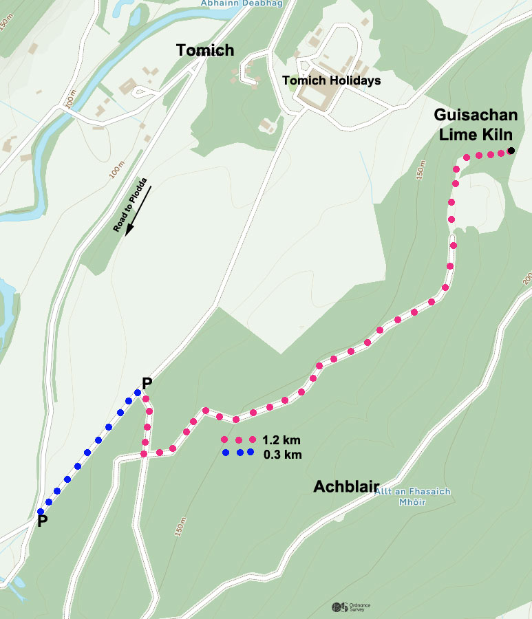 From Tomich village take the Plodda road, left at the fork, and after 1km turn into forest road on left hand side. Park here or further on at the entrance to forest – keep gates clear! Enter forest road and at junction turn left. Carry on skirting a large quarry to a forestry parking area. There is a marker post at the edge of the trees, From here a path leads up to the kiln.