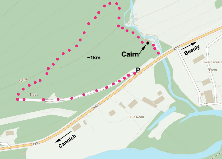 Car parking is at the entrance to forest road 0.5km east of Cannich on the A831. Follow forest road to the end where waymarker leads uphill on an old track. This goes up close to the tree line before crossing a dilapidated fence (another waymarker) and heads down hill between the fence and the Allt Coillte. The cairn is just over the fence from the marker post. Ground is quite uneven. Return by same way or alternatively head down to public road via narrow steep path keeping the fence to your right and away from the burn which ends in a splendid waterfall. Join the road at west end of old bridge. Turn right along road back to car park.